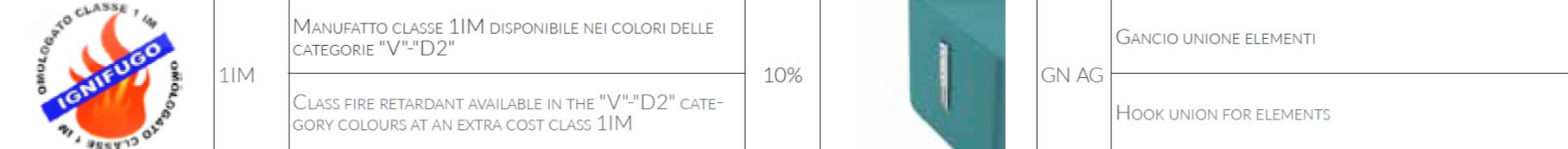 CONFORMITA' DEL PRODOTTO: -Omologazione ministeriale classe 1IM sul manufatto ( solo rivestimento cat. "V" "D2") su richiesta in fase d'ordine.