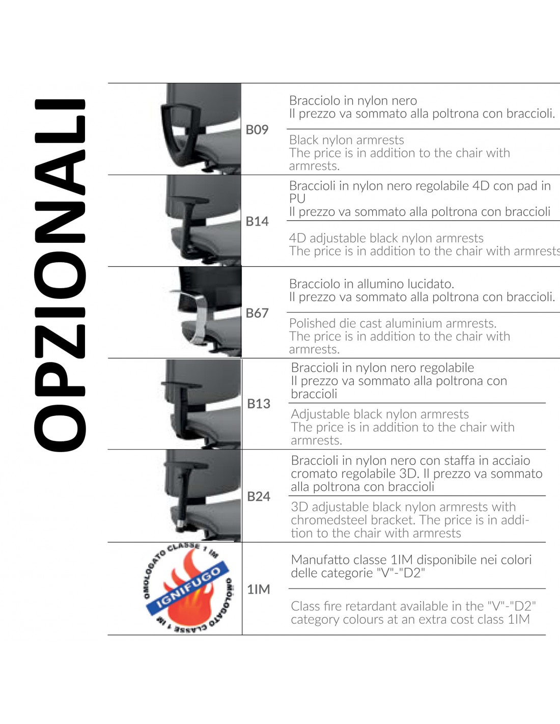 Leva per regolare l’altezza della seduta, leva per regolare l’inclinazione sedile e schienale sincronizzati, bloccabile in 5 posizioni + oscillante libero.