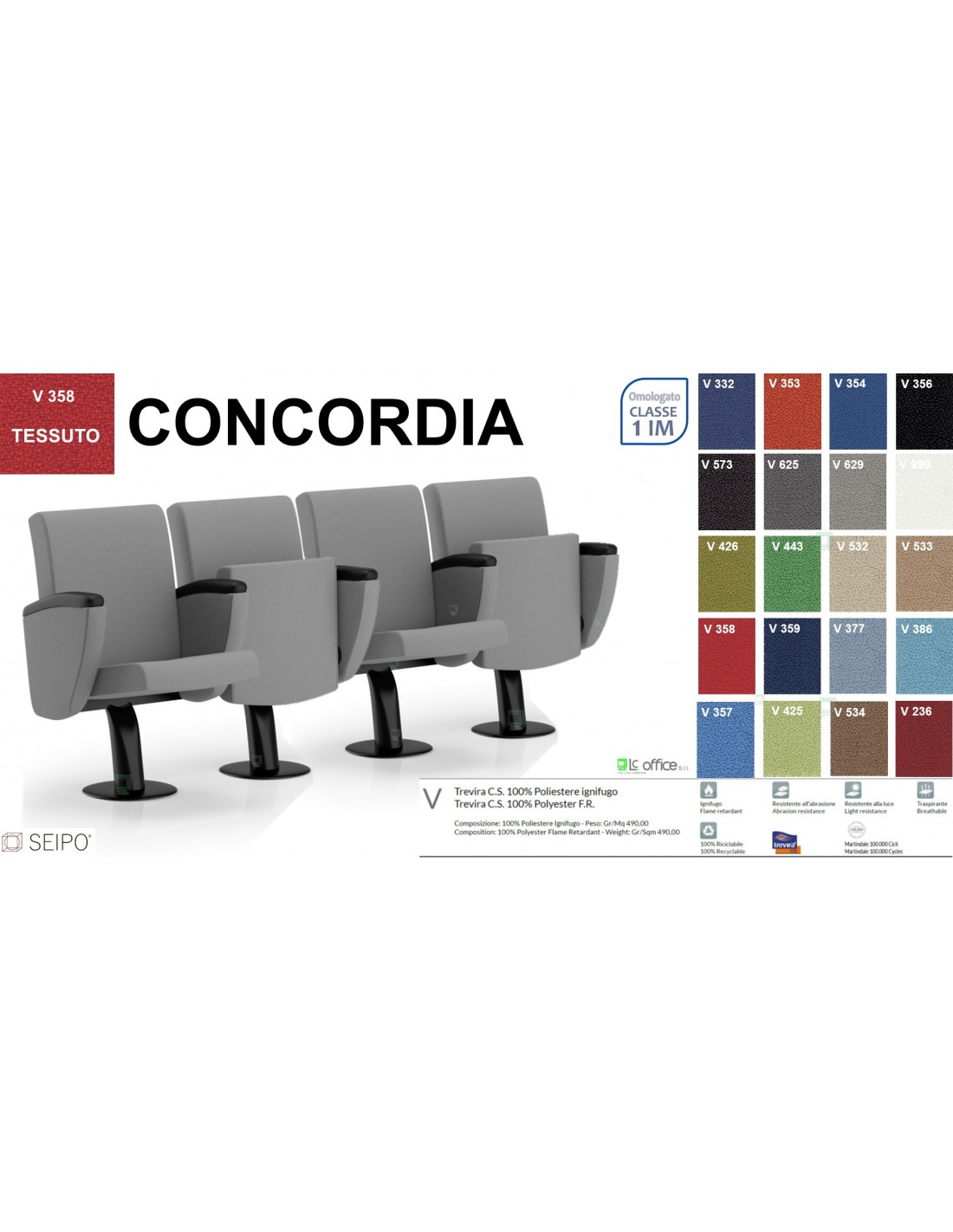Concordia CT1PS SQ PP 4 POSTI poltrona da sala cinema TEATRO su trave schienale QUADRO Seipo Tessuto V omologato CLASS 1 IM