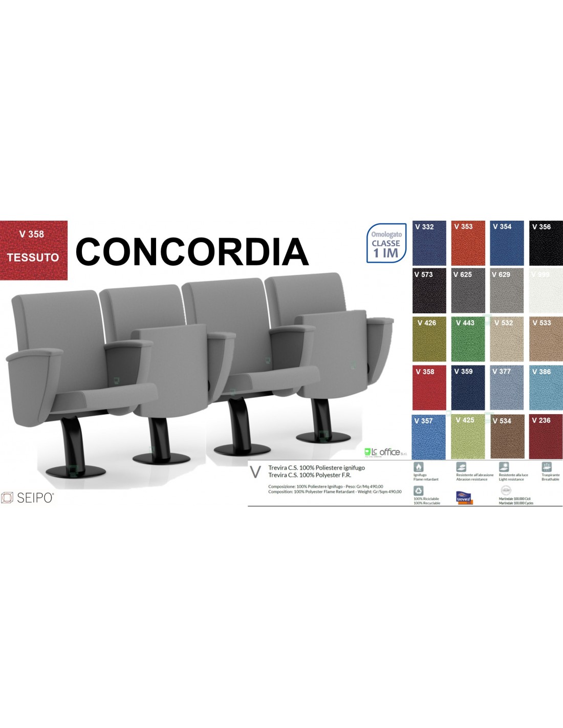 Concordia CT1PS SQ PI 4 POSTI poltrona da sala cinema TEATRO su trave schienale QUADRO Seipo Tessuto V omologato CLASS 1 IM