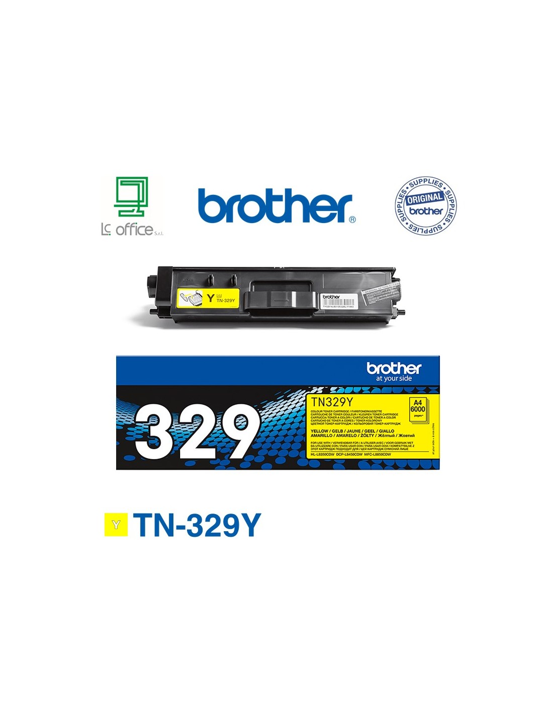 Il toner giallo originale ad altissima capacità Brother TN-329Y è utilizzabile con HL-L8350CDW, DCP-L8450CDW e MFC-L8850CDW.