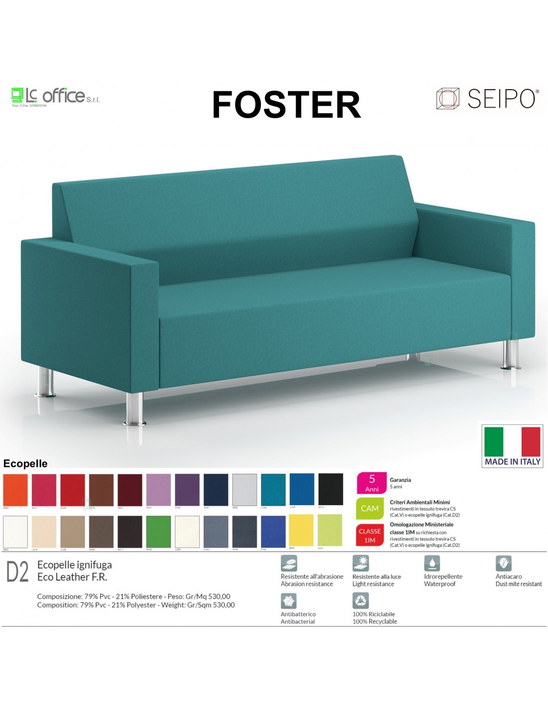 Foster F0042 divano 3 posti Imbottita Singola Base 4 piedi cromati Seipo ecopelle D2 CLASS 1IM