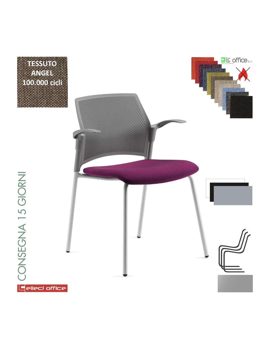 Free Sedia impilabile 4 gambe verniciato grigio sedile imbottito schienale tecnopolimero microforato rivestimento tessuto Angel