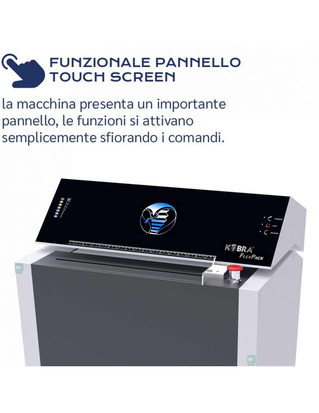 ■ Kobra Flexpack è dotata della più avanzata tecnologia Touch Screen: le funzioni si attivano semplicemente sfiorando i comandi. Una serie diLED indica la capacità di processo utilizzata dall’utente per evitare intasamenti e ottimizzare la distruzione.