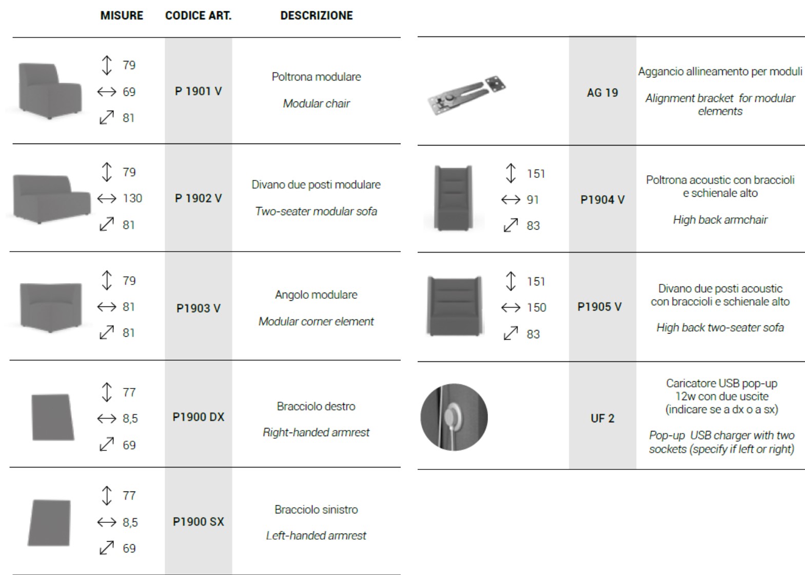Il primo codice si riferisce alle parti interne, sedile, schienale e braccioli; il secondo codice si riferisce alle parti esterne.