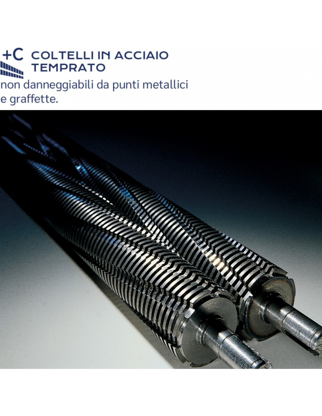 • Coltelli in acciaio temperato non danneggiabili da graffette e punti metallici