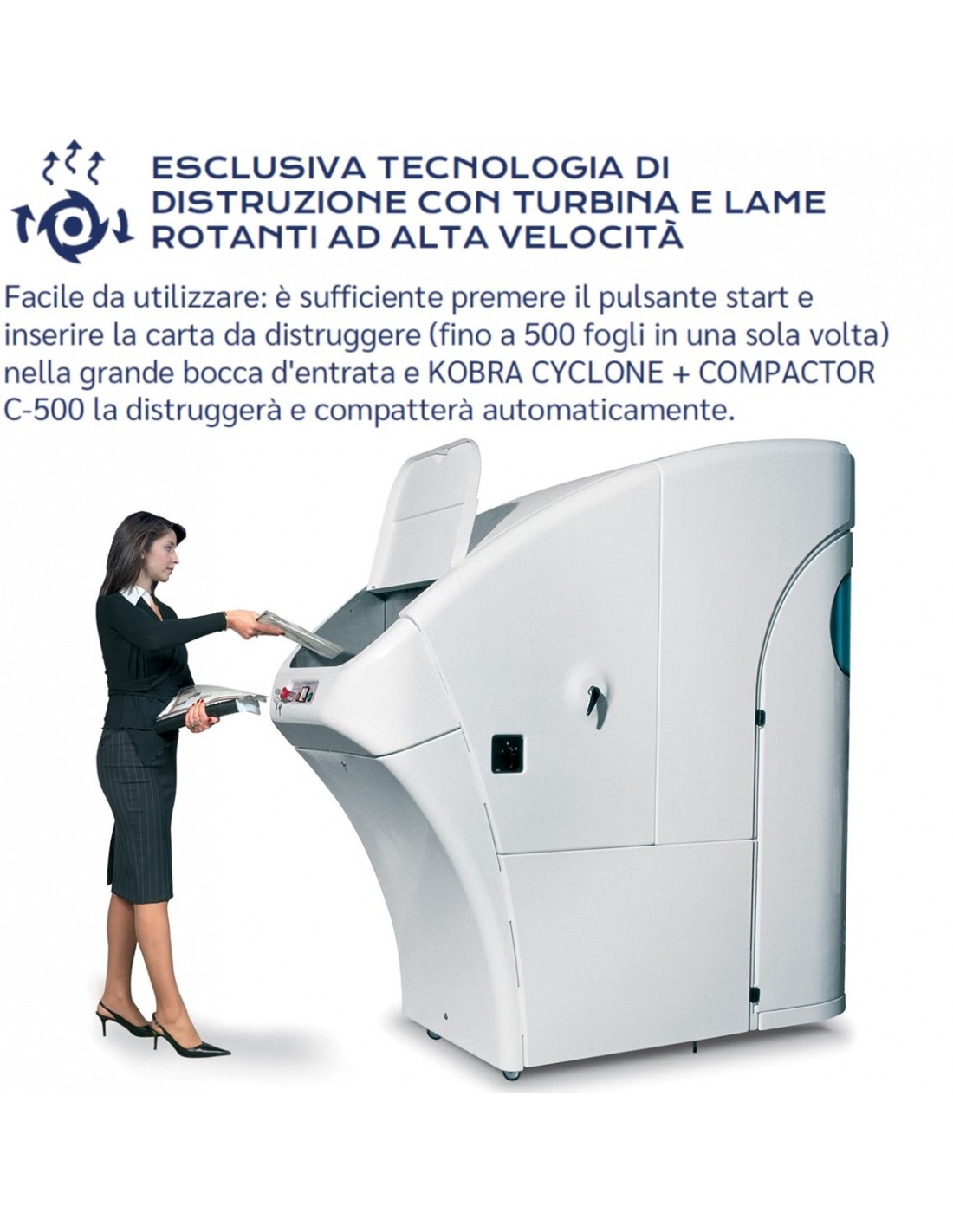 Speciale accessorio applicabile a Kobra Cyclone esclusivamente nelle distruzioni cartacee per compattare la carta distrutta riducendone il volume con un rapporto di circa 1:4 / 1: 5. Kobra Compactor C-500, di facile installazione e utilizzo, non richiede personale specializzato, facilita il riciclaggio della carta distrutta ed elimina le polveri compattandole con il materiale distrutto. Il materiale distrutto e compattato può essere raccolto in un qualsiasi contenitore o in un sacco-raccolta di plastica. Per distruzioni di materiale non cartaceo, si rimuove facilmente Kobra Compactor C-500 e si inserisce nella macchina il sacco raccolta standard.