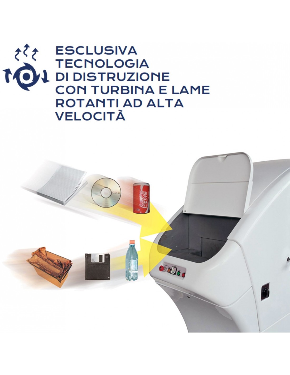 Tecnologia esclusiva: una turbina produce un flusso d'aria ad alta pressione che, in combinazione con un gruppo di lame rotanti ad alta velocità, distrugge il materiale; il flusso d'aria è forzato ad una rotazione ad alta velocità per produrre una forza centrifuga che espelle i frammenti depressurizzandoli nel compattatore che li espelle in forma compattata, riducendone il volume di 4-5 volte