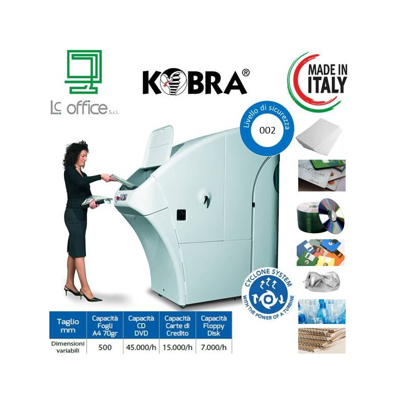 Kobra CYCLONE distrugge interi archivi (fino a 500 fogli per volta) e grandi quantità di CD, DVD, Blu-ray, Floppy Disk, carte di credito, cartoni, lattine di alluminio e bottiglie di plastica. È particolarmente indicato per gli Enti militari e governativi che richiedono l’alta sicurezza distruttiva. È facile e veloce da usare e non richiede manutenzioni nè lubrificazioni dei coltelli di taglio. Due livelli ad alta sicurezza disponibili: 005 (approvato dalla NATO) e 006 (conforme alle ultime norme per distruzioni classificate emesse dalla National Security Agency del Governo USA: NSA/CSS Specification 02-02 per la carta distrutta e NSA/CSS 04-02 per i supporti ottici).