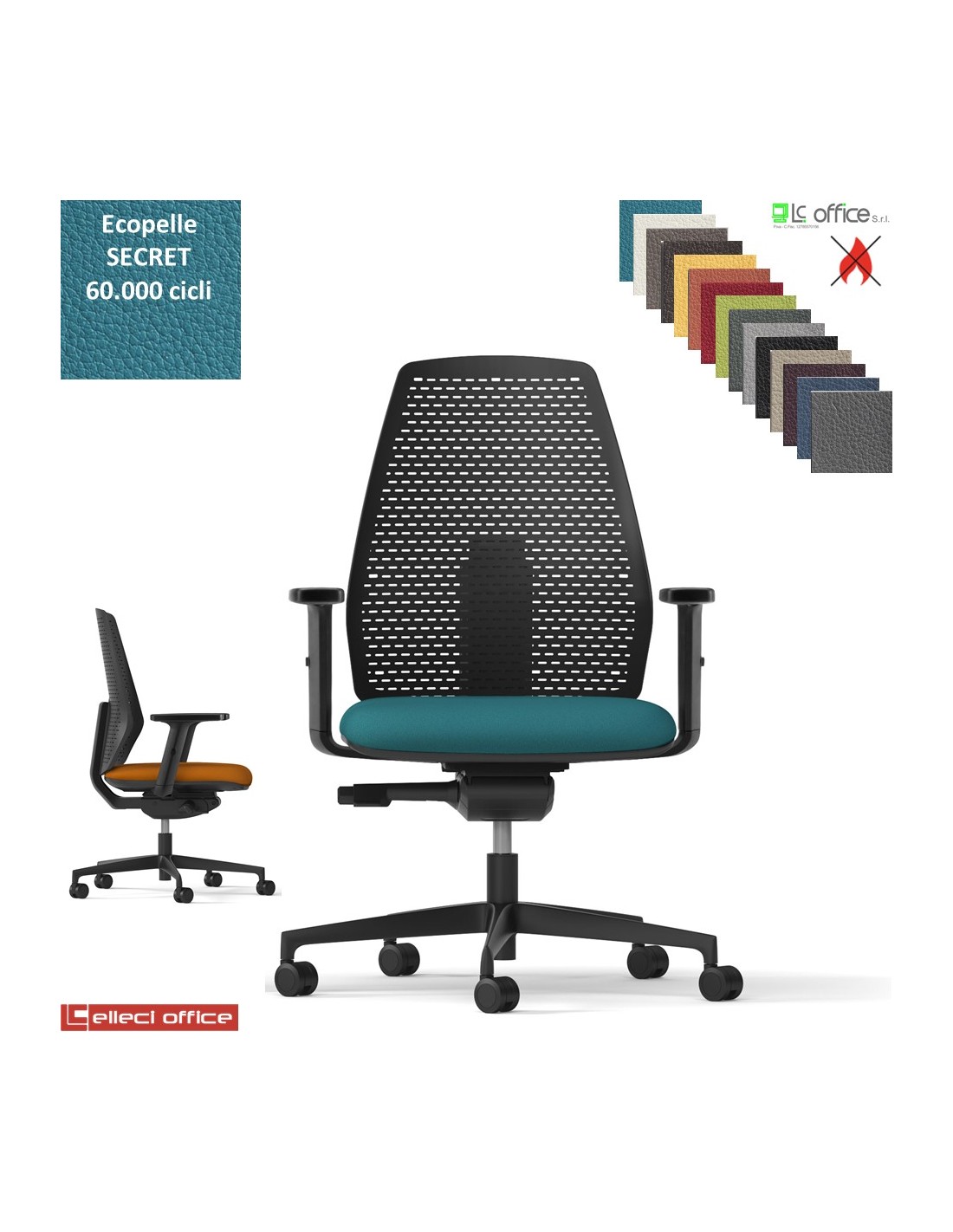 PIPER Poltroncina operativa ,schienale regolabile in altezza up-down, movimento sincronizzato autopesante con antishock e traslatore sedile, base e cover neri Coppia braccioli in polipropilenenero, regolabili in altezza con pad in PU orientabile e scorrevole rivestimenti in ecopelle SECRET class 1 IM