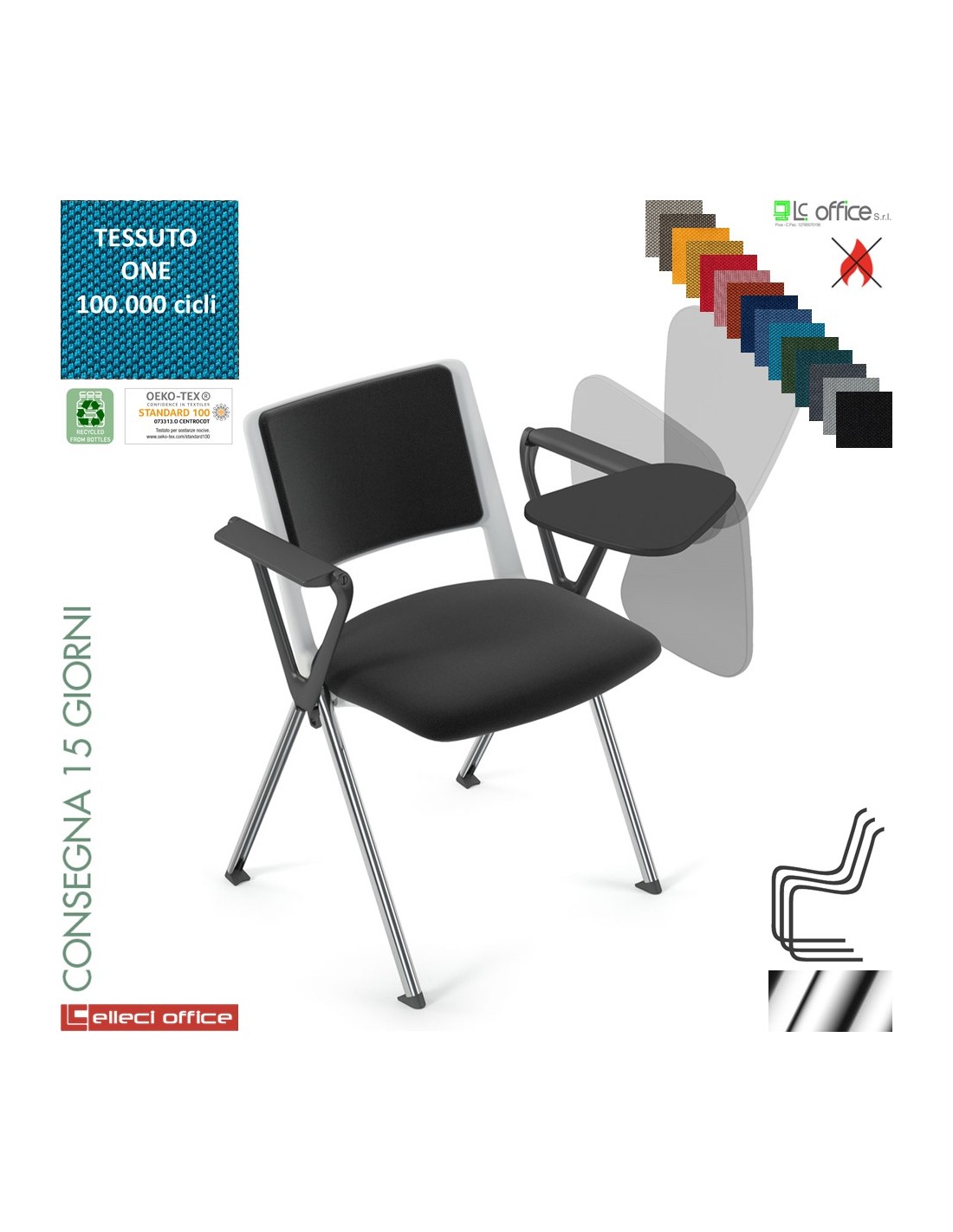 POP sedia impilabile sedile imbottito, schienale rete cover bianchi telaio 4 gambe cromo rivestimento ONE class 1 IM, con Bracciolo sinistro in alluminio verniciato nero con tavoletta antipanico e Bracciolo destro in alluminio, verniciato nero con pad ruotabile.