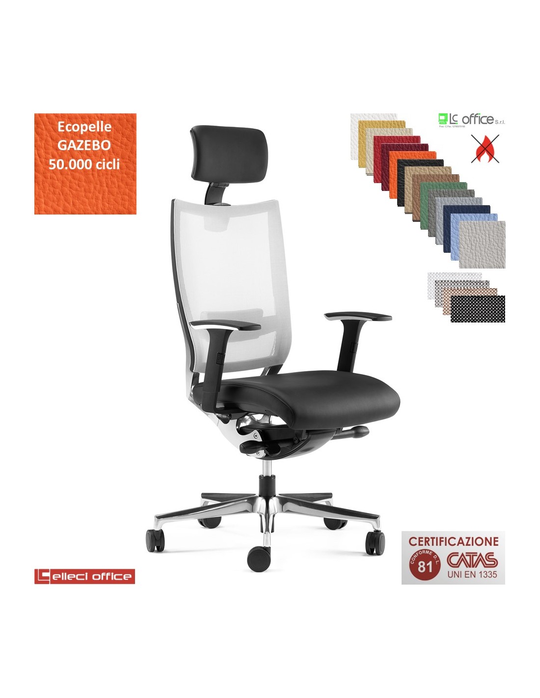 SHINE Poltrona direzionale con appoggiatesta, schienale nylon e alluminio, supporto lombare, movimento sincronizzato multiblock con supporto in alluminio, traslatore sedile, base alluminio braccioli in alluminio nylon con pad in polipropilene nero e profilo cromo rivestimento Ecopelle Gazebo Class 1 IM