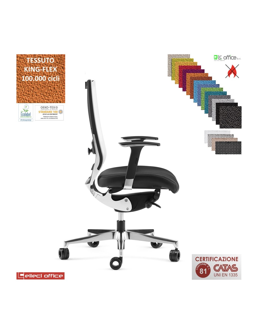 SHINE Poltrona semi direzionale, schienale nylon e alluminio, supporto lombare, movimento sincronizzato multiblock con supporto in alluminio, traslatore sedile, base alluminio braccioli in alluminio nylon con pad in polipropilene nero e profilo cromo rivestimento Tessuto King Flex omologato Class 1 IM