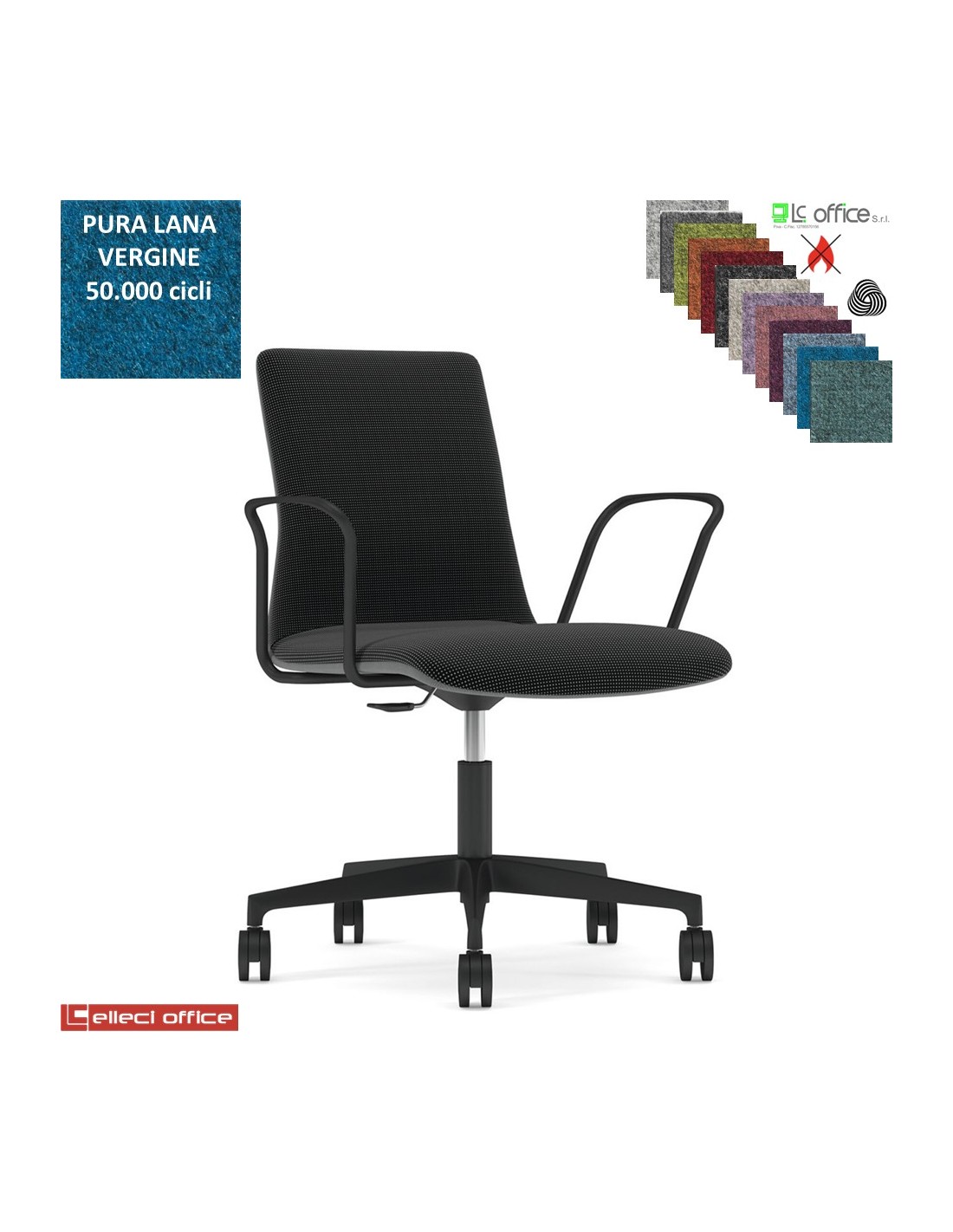 SORI Poltroncina girevole sedile schienale imbottiti braccioli base neri ruote alzata gas rivestimento in Lana vergine Class 1 IM