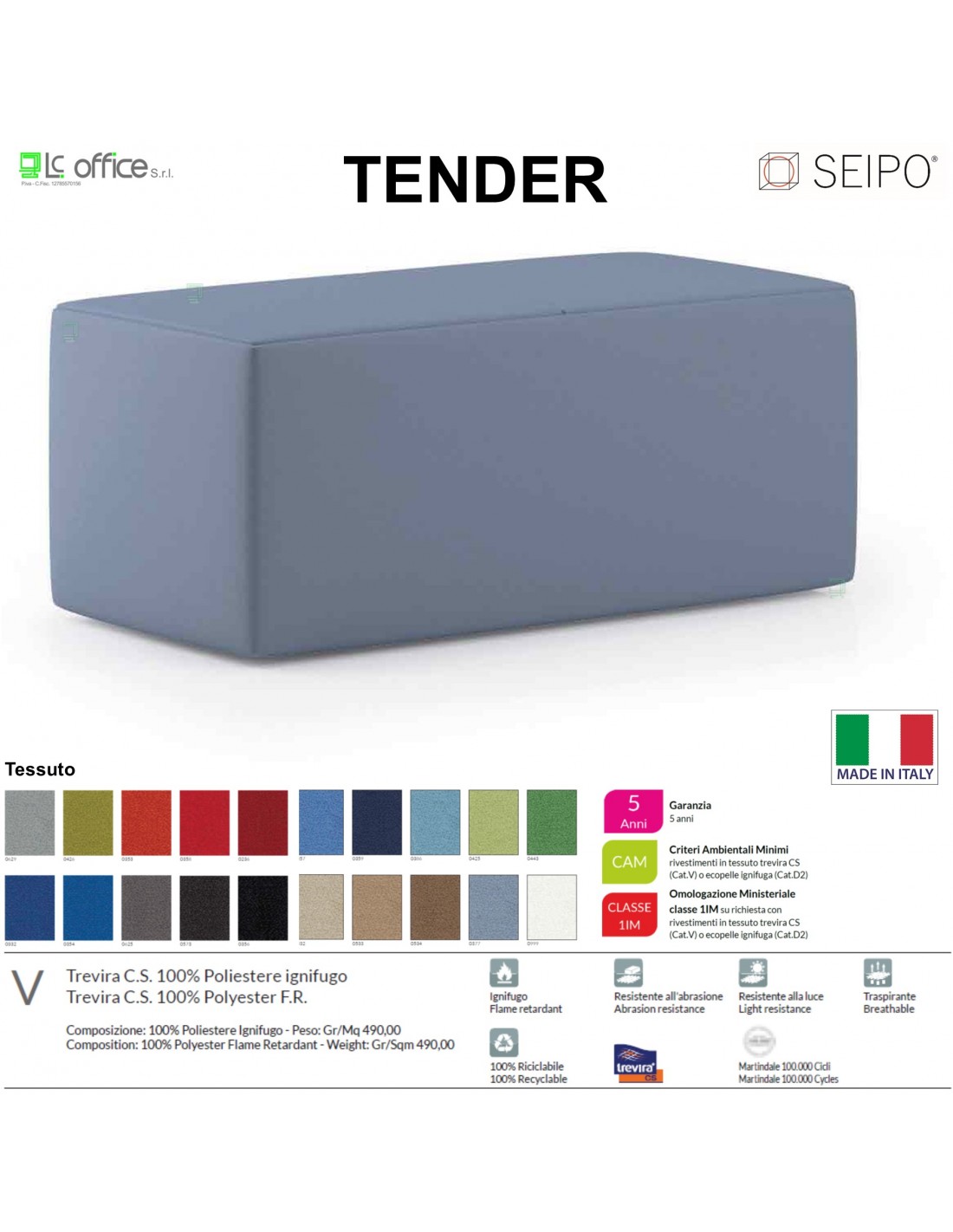 - Tessuti acrilici (categoria "K") - Ecopelle ignifuga (categoria "D2") - Ecopelle (Categoria "D") - Pelle genuina (Categoria "Pelle") - Tessuti ignifughi (categorie "B"-"V"-"M"-"T"-"S")